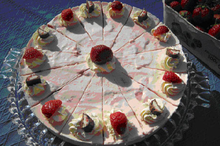 Schicht-TorteRezeptangaben für Form Ø 26 cm 1. Boden: Zwieback mit einem Nudelholz in einem Beutel zerkleinern. Brösel in eine Schüssel geben und mit dem Zucker und der Butter vermischen. Tortenring auf einen Tortenteller stellen. Masse hineingeben und andrücken. 2. + 3. Boden: Zwei Springformen mit Backpapier auslegen. Backofen auf 180°C Umluft vorheizen. Butter und Salz schaumig schlagen. Eigelb, Milch u. Speisestärke hinzufügen. Eiweiß und Zucker steif schlagen. Unter die Eimasse heben. Eimasse auf beide Formen gleichmäßig aufteilen und ca. 5-7min backen. Füllung: Quark auspressen und mit Philadelphia mischen. Eigelb und Puderzucker 5min aufschlagen. Quarkmasse unterrühren. Kühl stellen. Preiselbeeren und Rotwein erhitzen und durch ein Sieb streichen. Pfirsiche pürieren. Einen Teil der Preiselbeermasse dünn auf den Zwiebackboden streichen. 4 Blatt weiße Gelatine in etwas Wasser quellen lassen, ausdrücken und unter schwacher Hitze auflösen. Mit 1/3 der Quarkmasse und den pürierten Pfirsichen vermischen. 125 g Sahne steif schlagen und unterheben. Masse auf den Zwiebackboden füllen und kühl stellen. 4 Blatt weiße Gelatine in etwas Wasser quellen lassen, ausdrücken und unter schwacher Hitze auflösen. 1/3 der Quarkmasse, ausgekratztes Vanillemark, Vanillezucker und der geriebene Zitronenschale mischen. Aufgelöste Gelatine unterrühren. Einen gebackenen Boden auf die Pfirsichschicht legen, Vanillemasse einfüllen und kühl stellen. 5 Blatt rote Gelatine quellen lassen, ausdrücken und erwärmen. Die Hälfte der Preiselbeermasse mit der restlichen Quarkmasse verrühren, mit dem Saft der Zitrone abschmecken, die Gelatine unterziehen. Zweiten Boden auf die Vanillemasse legen und die rote Quarkmasse einfüllen. 2 Blatt rote Gelatine quellen lassen, ausdrücken, erwärmen und unter die restliche Preiselbeermasse rühren. Torte über Nacht im Tortenring kühl stellen. Torte aus dem Ring nehmen, restliche Sahne steif schlagen, den Rand der Torte einstreichen und mit den Schokoraspeln bestreuen. |